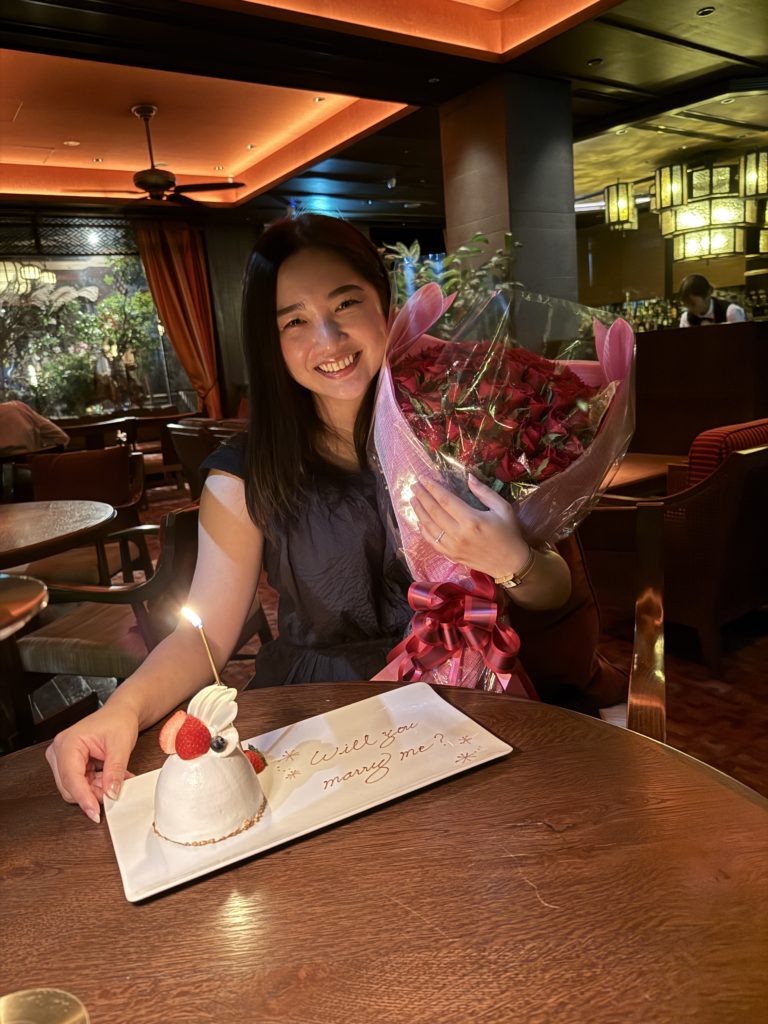 「遅くなってごめんね、結婚してくれますか?」と改めて言われ、「Yes、はい」とお答えし指輪をはめてもらいました。